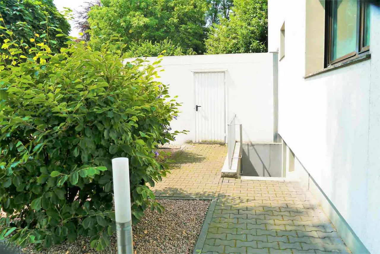 Hausgroße Erdgeschosswohnung mit großem Grundstück u. direktem Zugang zur überlangen Garage.