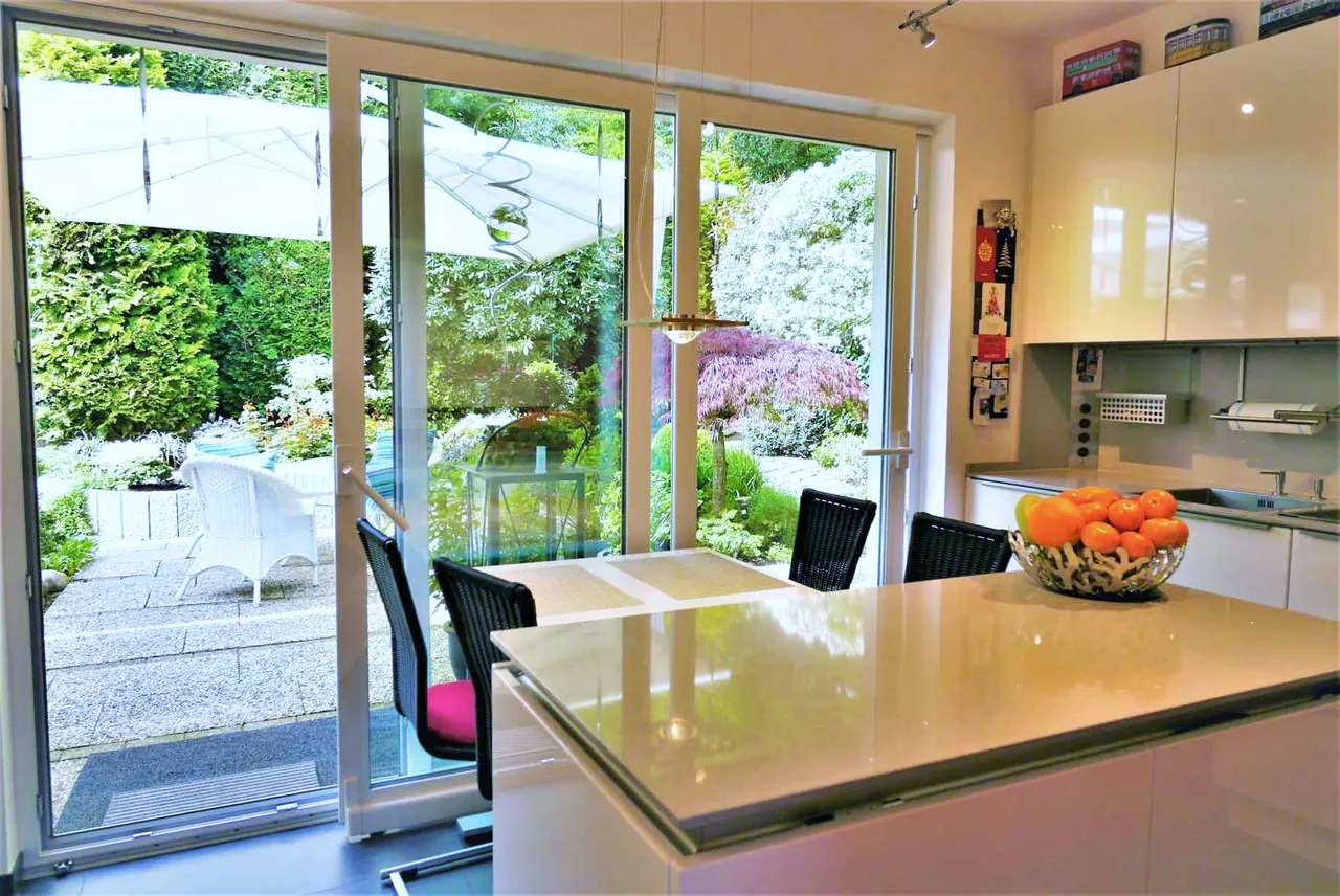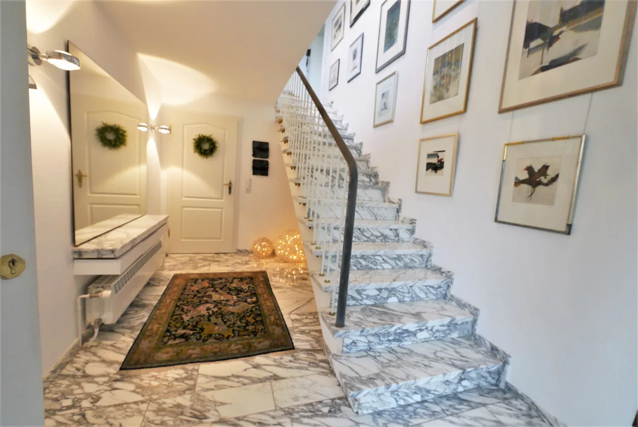 Entrée, Marmortreppe, Essdiele, Küche, Doppel-Wohnzimmer durch Schiebetür teilbar, Terrasse