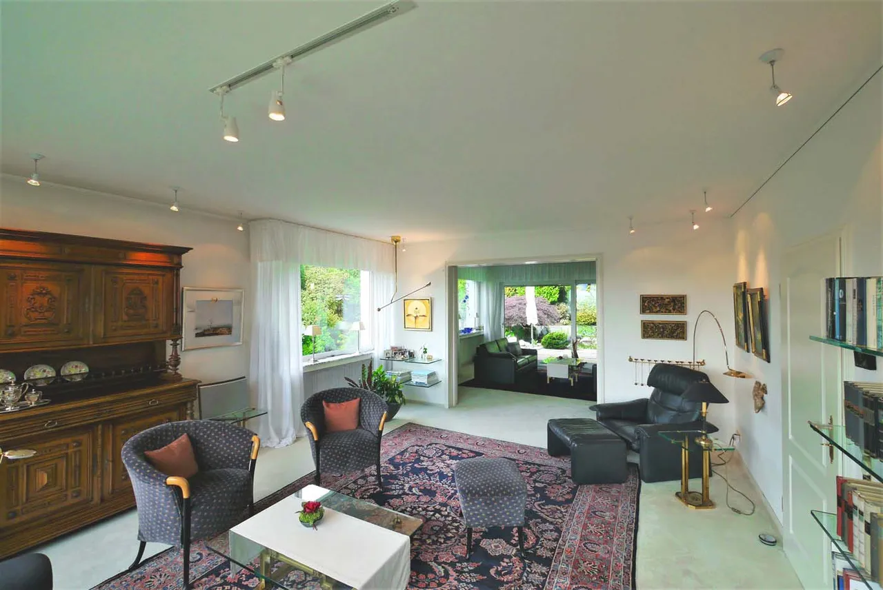 Dreiseitig umrahmt ist die Immobilie durch eine aufwändig gestaltete Gartenanlage und grenzt an der vierten Seite an einen kleinen Wald.