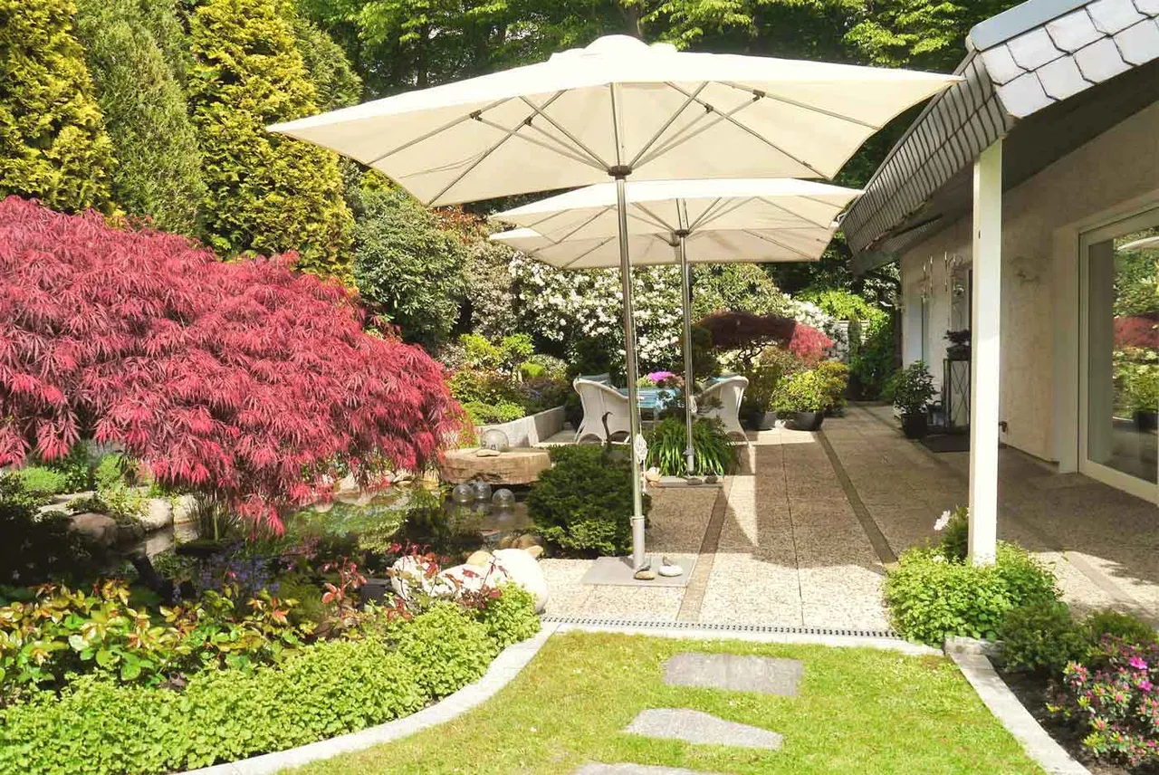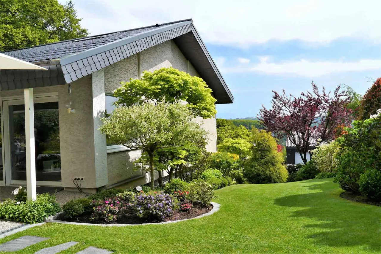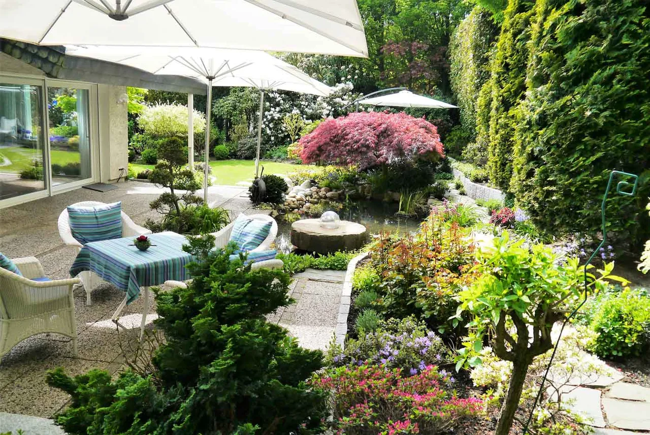 Die Gartenbereiche vor und hinter dem Haus sind außergewöhnlich bis ins Detail gepflegt und mit attraktiver junger Bepflanzung ausgestattet. Die meisten Käufer unterschätzen die Planungs-u. Herstellungskosten u. damit den Wert einer solch fertigen Gartenanlage.